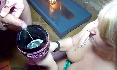 Submissive slut swallows a jizm and piss cocktail – gagging!